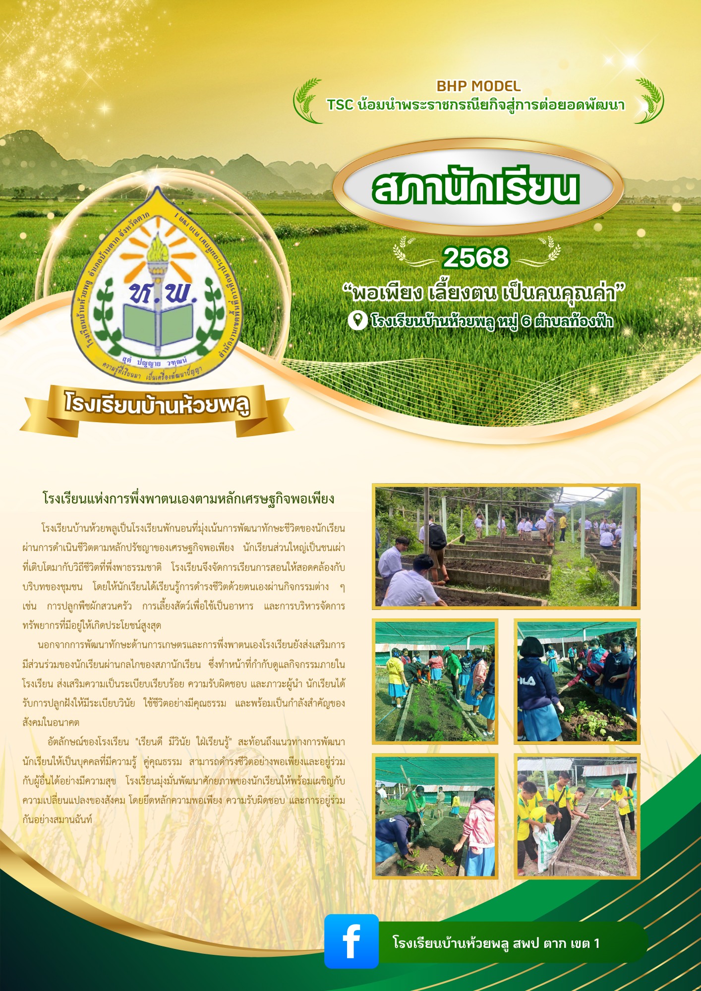 สภานักเรียนโรงเรียนบ้านห้วยพลูขับเคลื่อน 3 ภารกิจสำคัญ ได้แก่ โรงเรียนแห่งการพึ่งพาตนเองตามหลักเศรษฐกิจพอเพียง ส่งเสริมการปลูกผัก เลี้ยงสัตว์ และบริหารทรัพยากรอย่างรู้คุณค่า โรงเรียนปลอดภัย ห่างไกลยาเสพติด สร้างสภาพแวดล้อมที่ปลอดภัย พร้อมกิจกรรมสร้างสรรค์ให้เยาวชนใช้เวลาว่างอย่างมีประโยชน์ และ ชวนน้องกลับมาเรียน ติดตามและช่วยเหลือนักเรียนที่หลุดออกจากระบบให้กลับมาได้รับโอกาสทางการศึกษาอีกครั้ง เพราะเราเชื่อว่าโรงเรียนที่ดี ต้องเป็นพื้นที่แห่งการเรียนรู้ที่เท่าเทียม ปลอดภัย และพอเพียง |